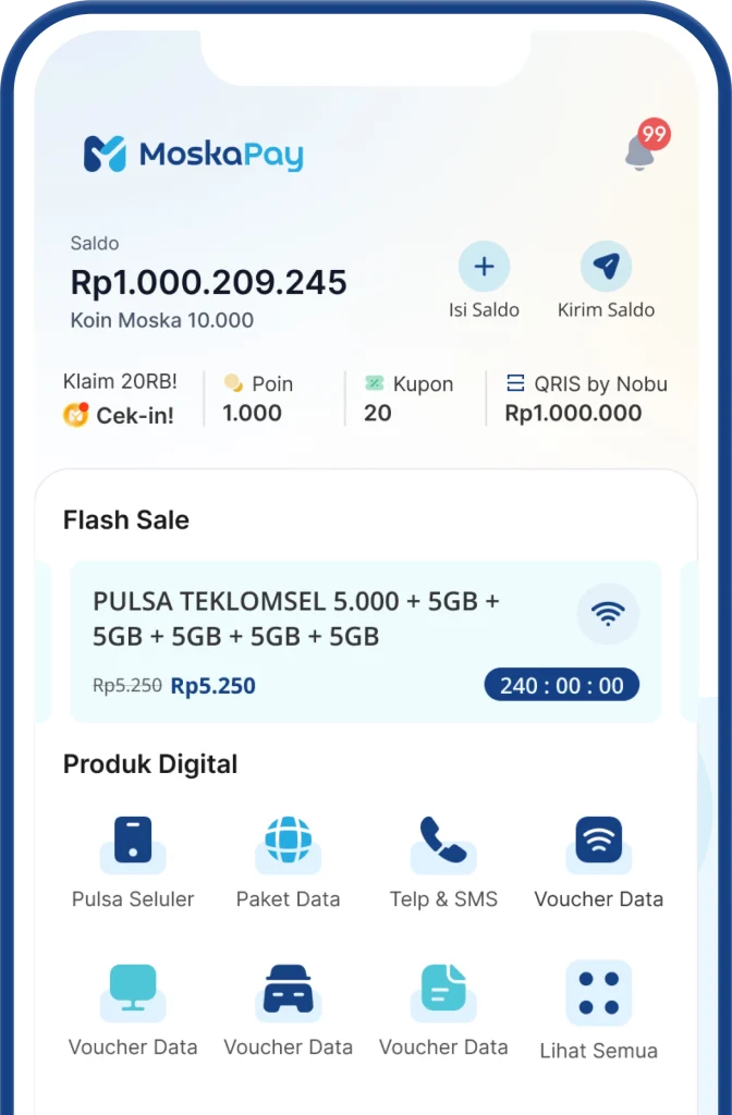 Jadi agen pulsa dan PPOB profesional dengan Moskapay. Nikmati isi pulsa kilat, bayar tagihan, dan top up e-wallet dalam hitungan detik. Dapatkan juga poin, hadiah, dan komisi menarik di setiap transaksi.